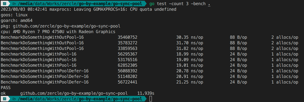 ตัวอย่างดัดแปลงจาก sync example-Pool โดย DoSomethingWithOutPool เป็นท่าดั้งเดิมแบบไม่ใช้ pool DoSomethingWithPool ใช้ pool โดยการ put กลับเข้า pool หลังจากใช้งานเสร็จ DoSomethingWithPoolDefer ใช้ pool โดยการ defer put กลับเข้า pool หลังจากจบ function